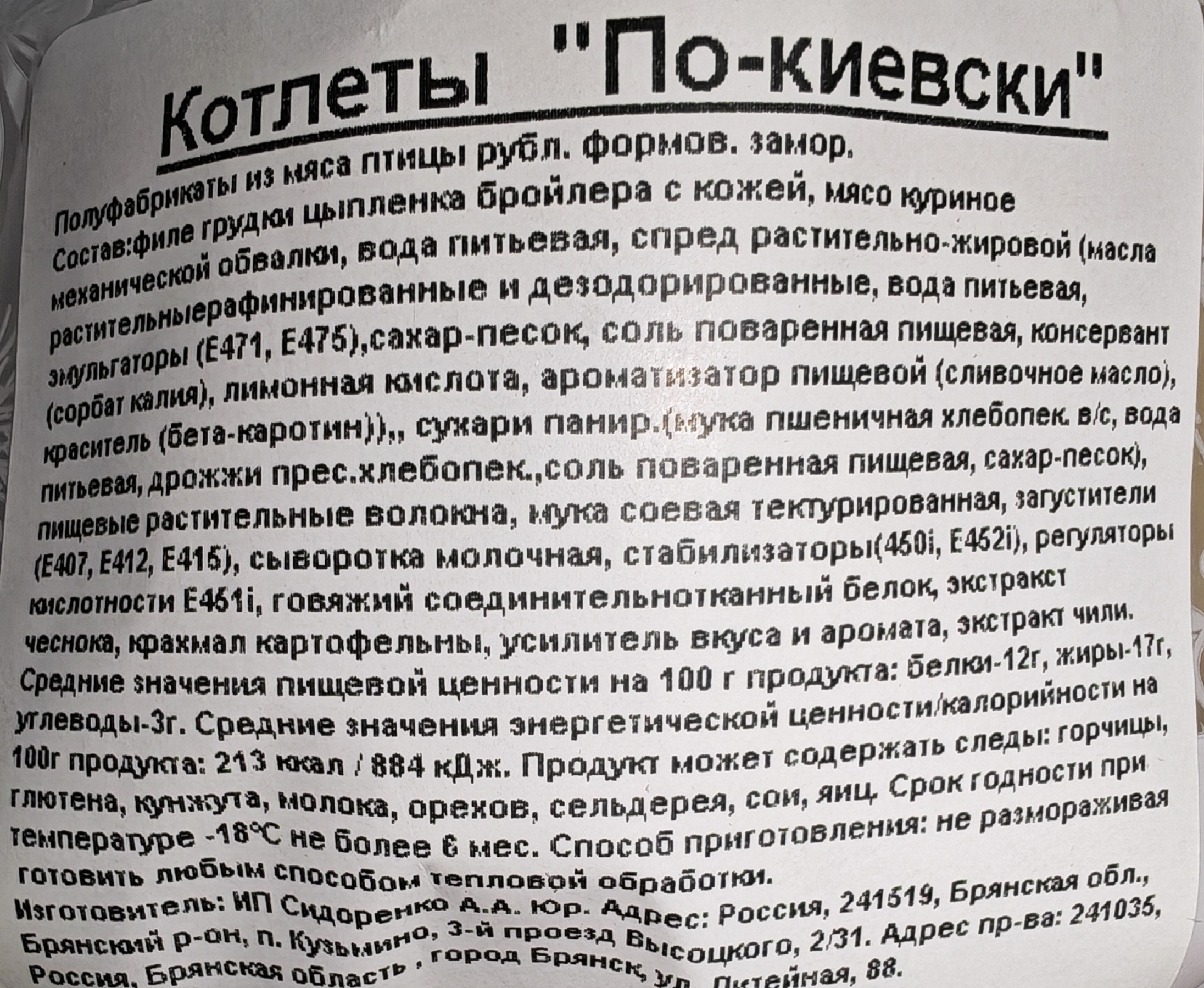 Котлеты По-киевски куриные, ИП Сидоренко