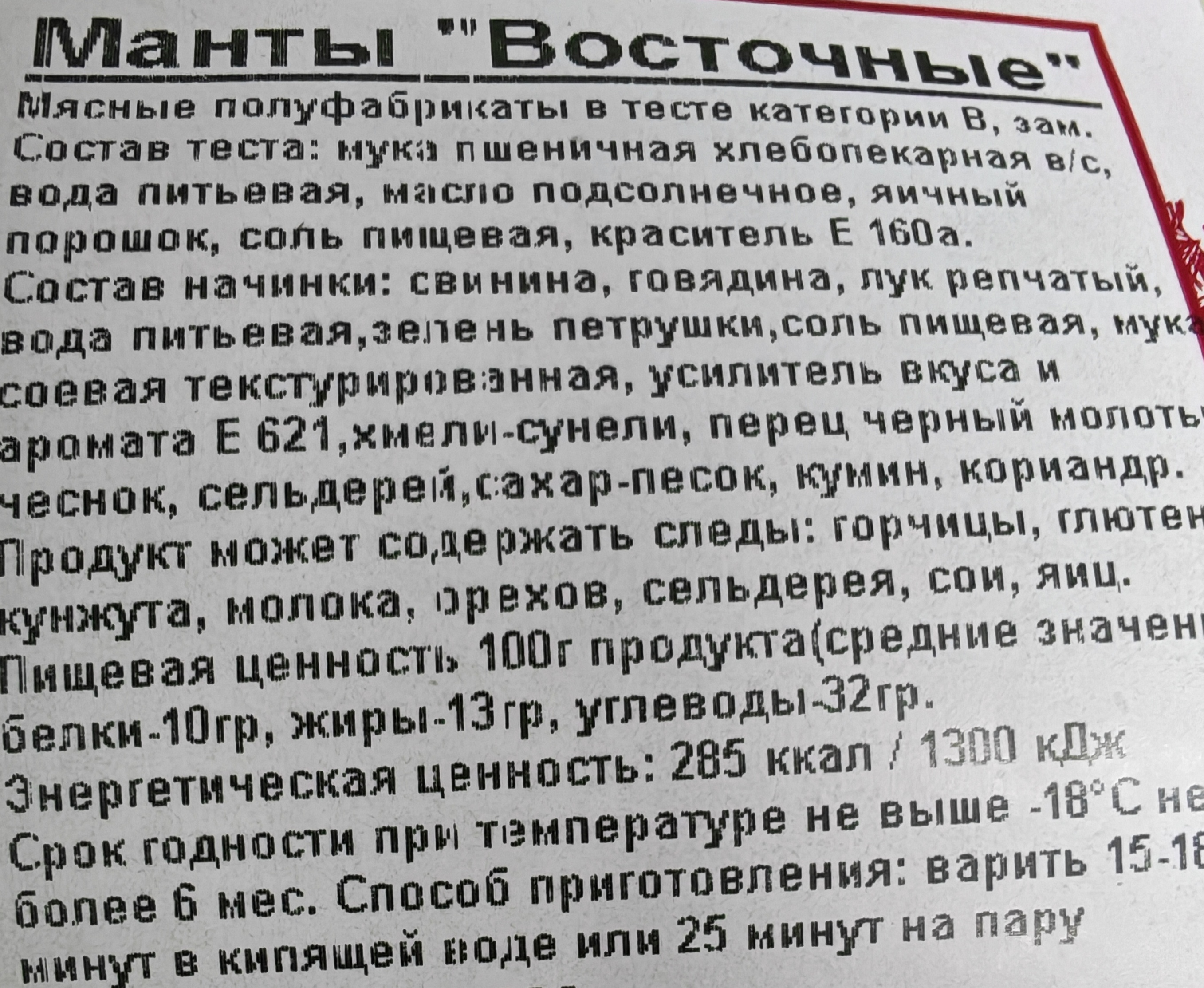 Манты ВОСТОЧНЫЕ прим вес 1кг ИП Сидоренко А.А.