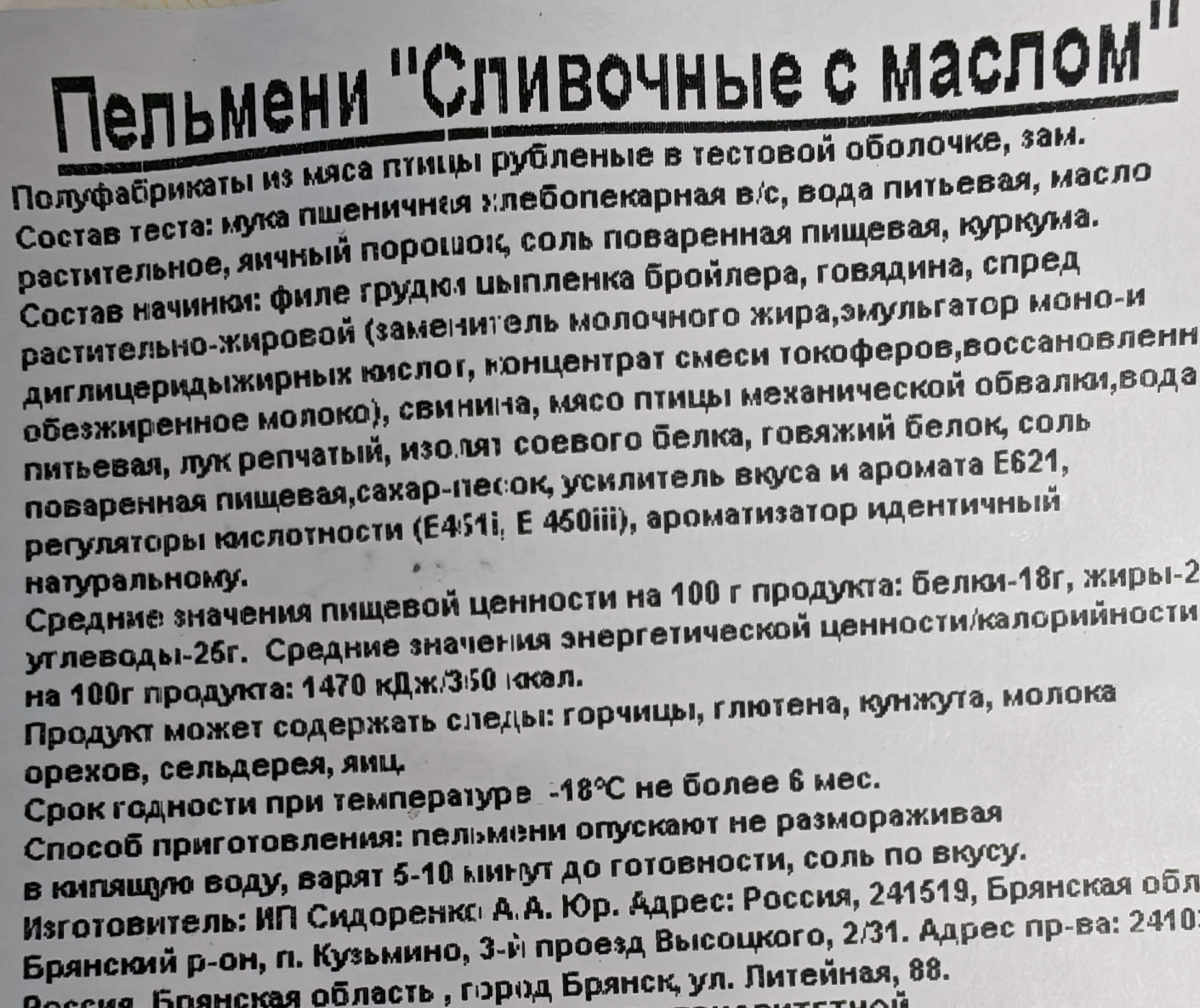 Пельмени Сливочные с маслом св/кур фас. 500гр ИП Сидоренко А.А.