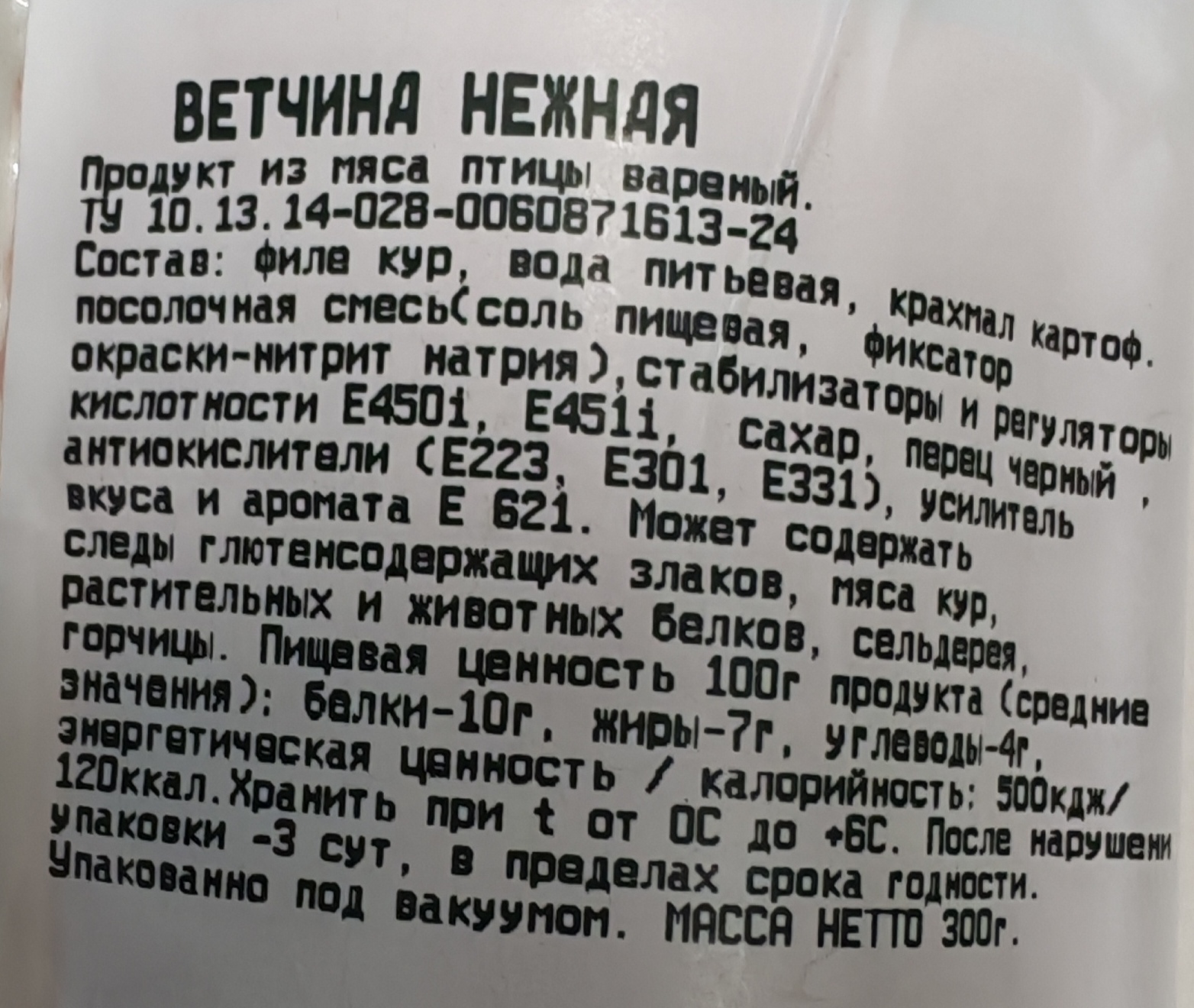 Ветчина "НЕЖНАЯ", в/у, 300гр, Бычков